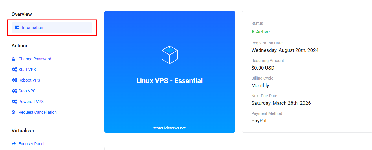 After the reinstall is complete, return to your VPS management page and check the updated server details.