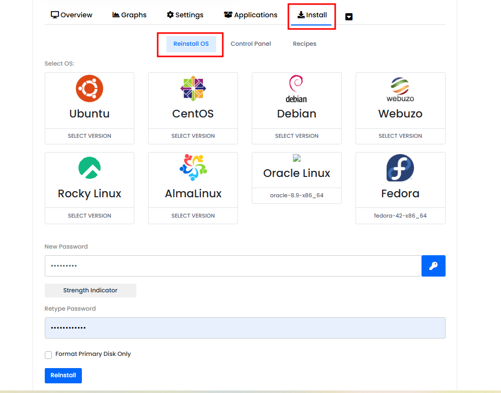 Before you begin, keep in mind that reinstalling the operating system will usually erase the existing data on the VPS. Always make sure you have a full backup of your files, databases, and settings before making any changes.